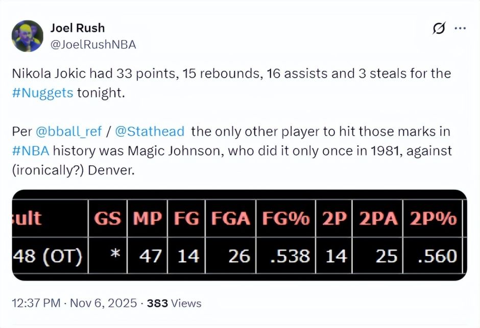 7.单场拿到33+15+16+3抢断的球员历史只有两人,第一位是1981年的魔术师,第二位就是约基奇;
