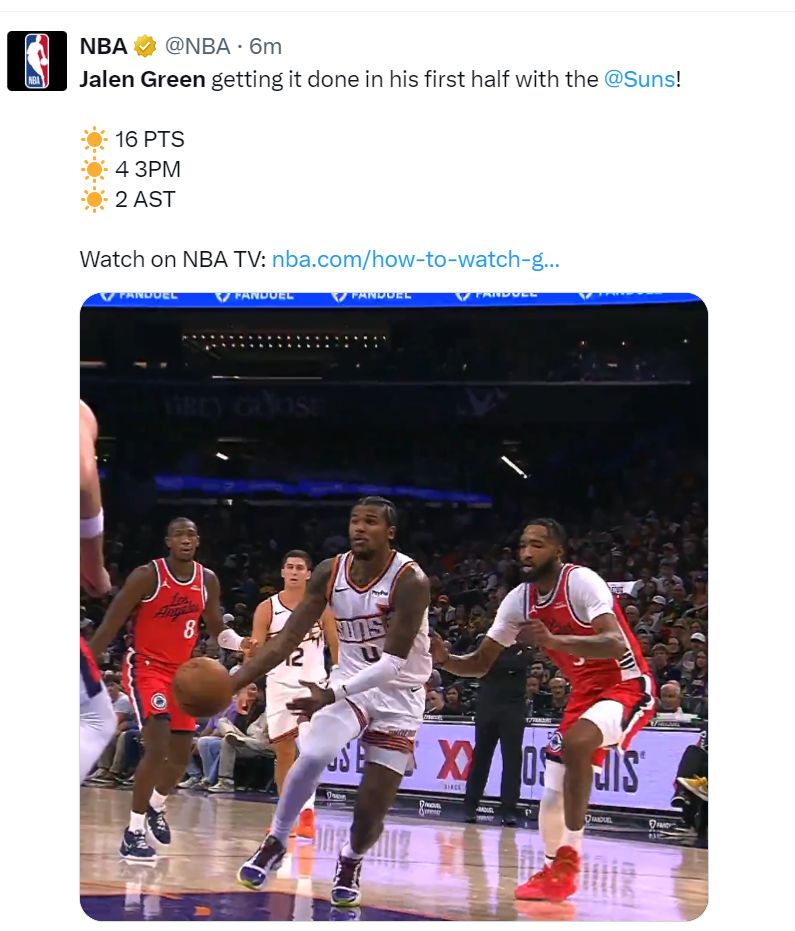 次节格林的发挥依旧不错,接布克分球后外线三分命中,随后持球突破分球马威暴扣,杰伦-格林底线三分命中后帮助球队反超,全场球迷起身为他呐喊。上半场打完格林13分钟,13中6,三分9中4拿到16分2篮板2助攻1抢断,NBA官方都点赞了。
