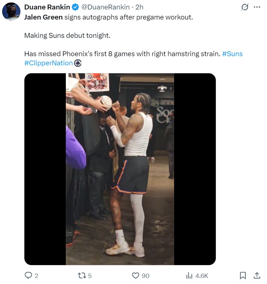 虽然很多人觉得火箭与太阳的交易杰伦-格林算个负资产,可他在凤凰城还是有不少支持者,赛前很多人来要格林的签名,格林还是很暖的一一满足球迷们。