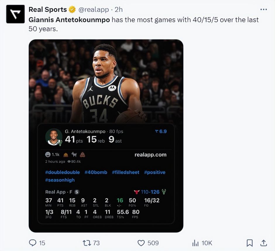 末节19分万夫莫敌!字母哥41+15又刷纪录 美媒晒数据赞世界最强