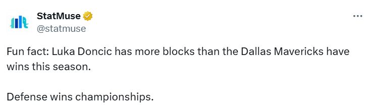 “趣味事实:东契奇本赛季的盖帽数,比独行侠的胜场数还多。防守赢得总冠军。”