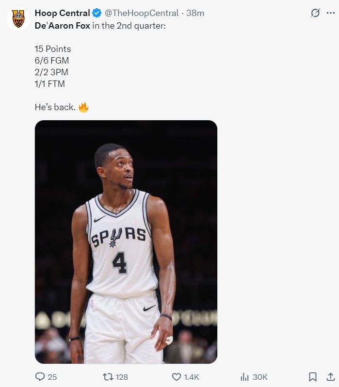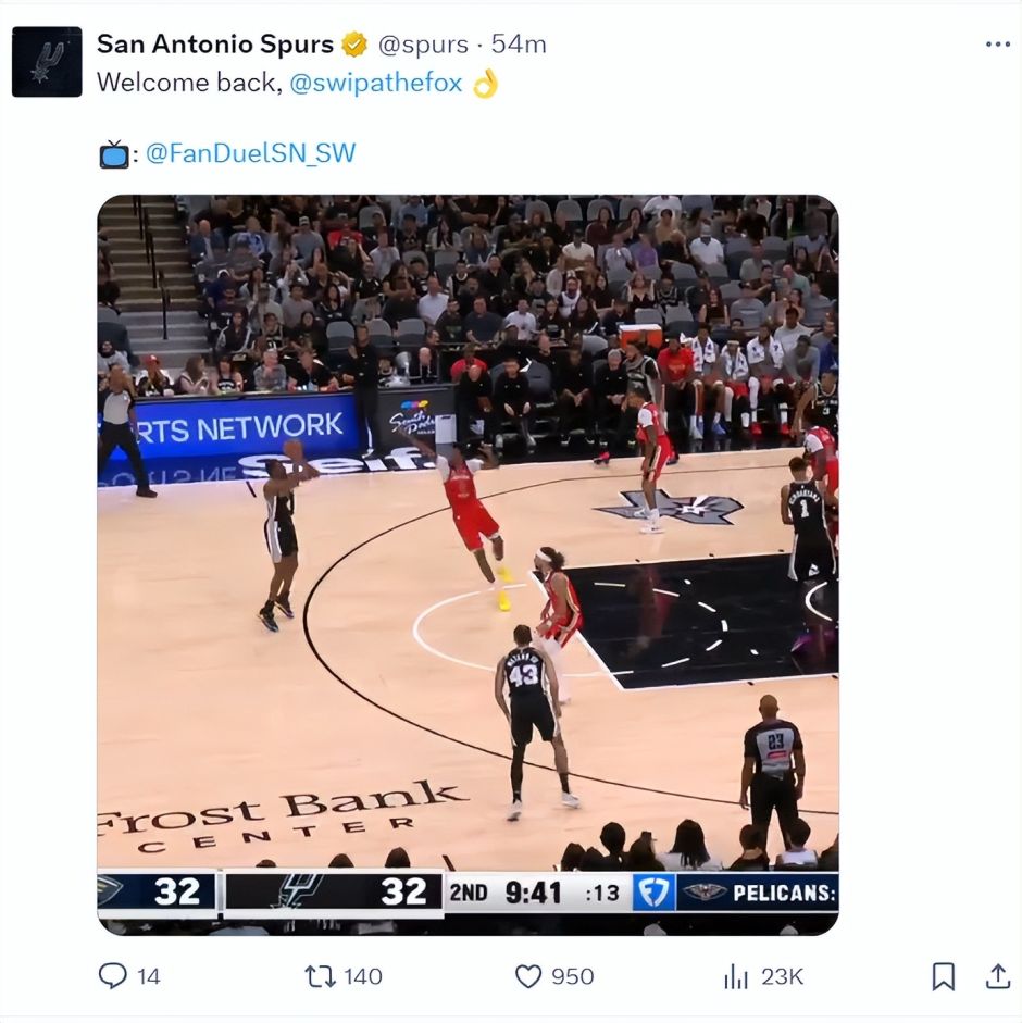 福克斯首节是2中0,他第二节才完成第一个运动战三分,马刺官方也欢迎他归来。