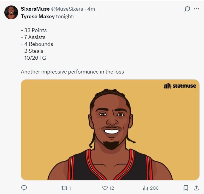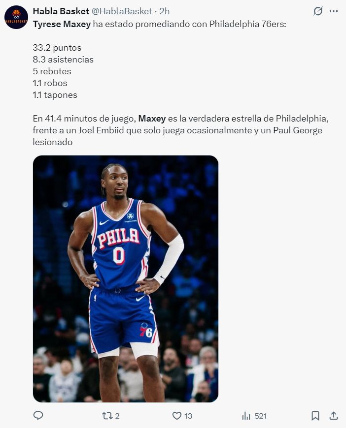 全场比赛马克西打了38分钟,26中10,三分12中4,罚球9中9,拿到33分7助攻4篮板2抢断,命中率38.5%,三分命中率33.3%,末节马克西一人狂砍15分,在没有恩比德、乔治的情况下他独扛一队,埃奇库姆、格兰姆斯此役也哑火。