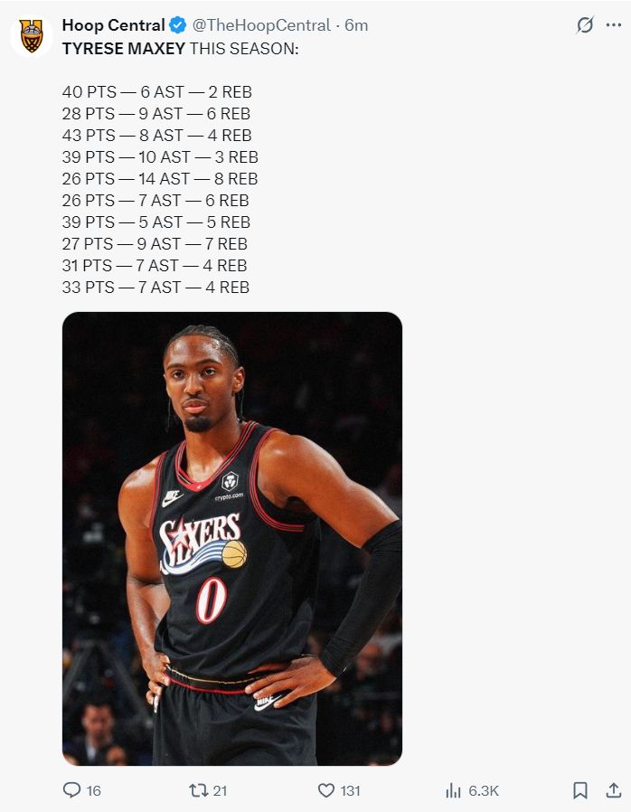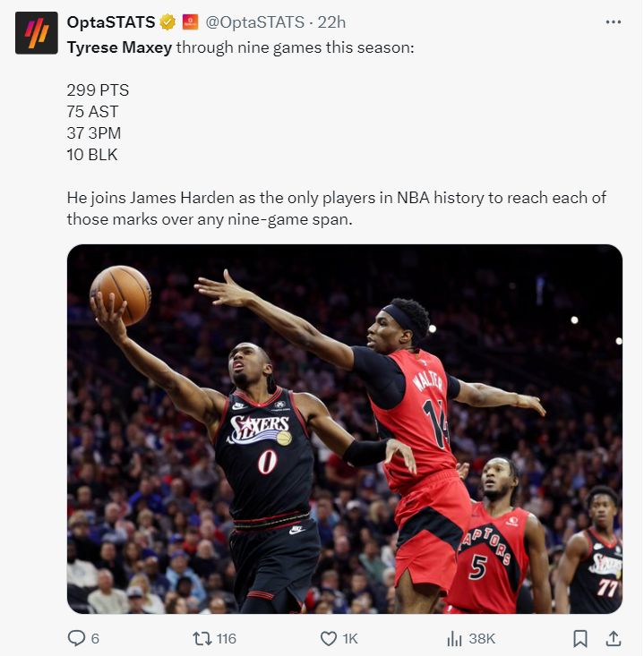 马克西是上周的东部周最佳,美媒晒出了他新赛季10场比赛的数据,这10场比赛他已经拿到332分83助攻50篮板,也就是场均33.2分,费城的新艾弗森就此诞生了。