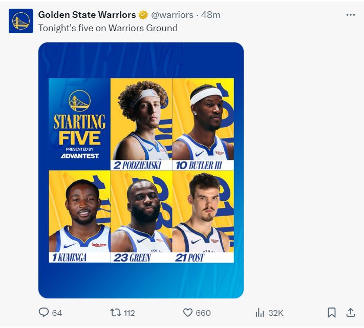 勇士:波杰姆斯基、巴特勒、库明加、格林、波斯特;