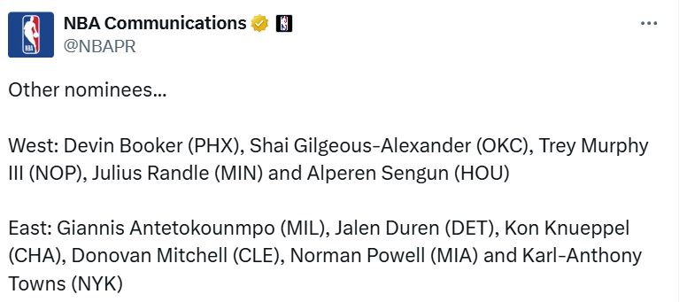 北京时间11月11日,NBA官方公布了第三周的周最佳球员。掘金中锋约基奇当选西部周最佳球员,活塞后卫坎宁安当选东部周最佳球员。申京、字母哥等球星获得提名。