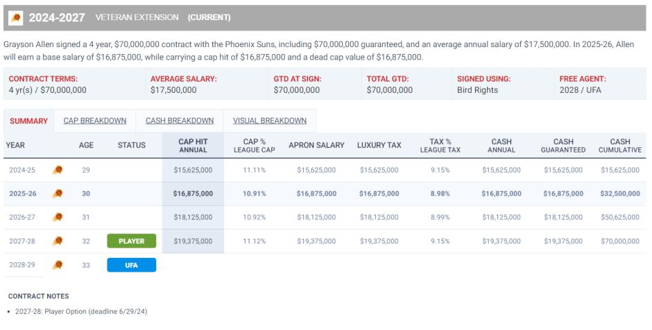 阿伦这份合同,27-18赛季是球员选项,他的均薪只有1750万,说实话真的不贵,这个级别的投手还有防守,很多季后赛球队都需要。