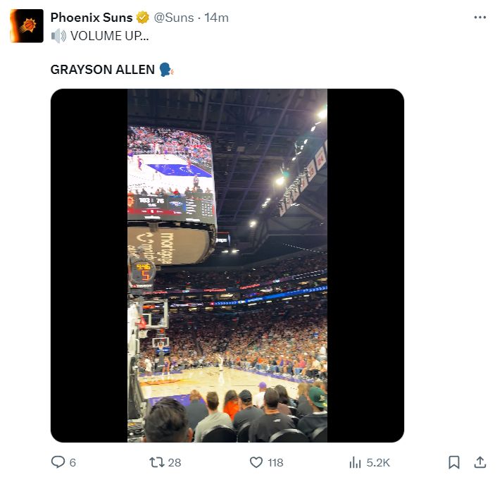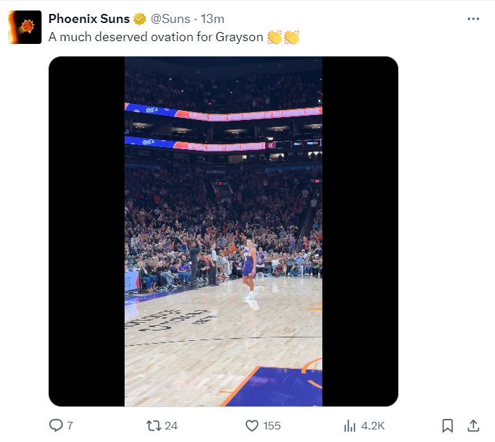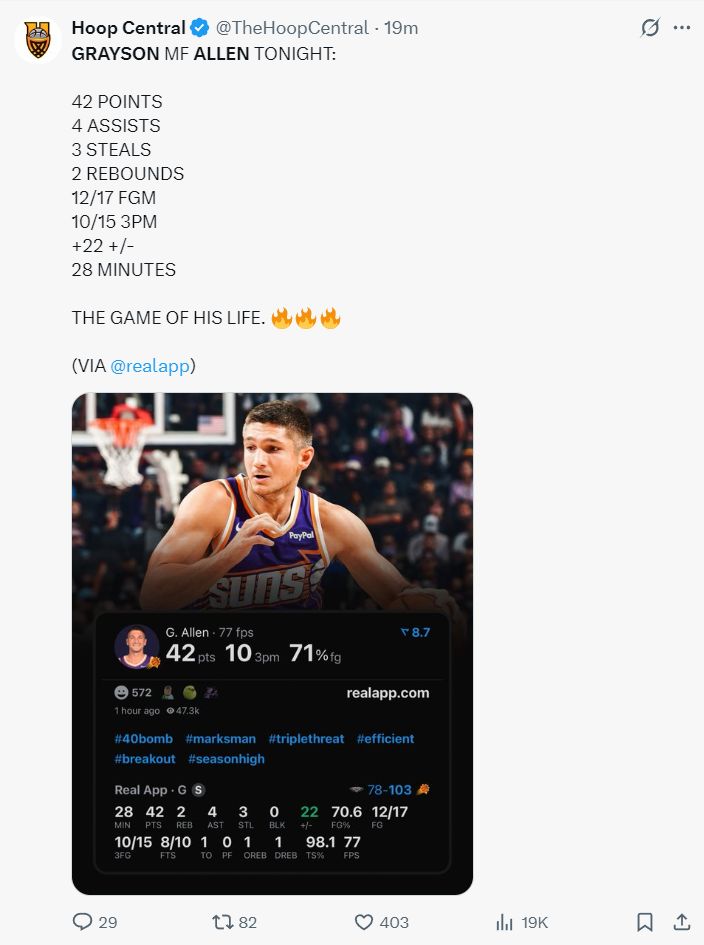 太阳官方这场比赛成为阿伦第一粉头,我数了一下关于阿伦的推文30分钟内有7条,因为阿伦在不断逼近队史单场9个三分纪录与阿伦生涯最高分。