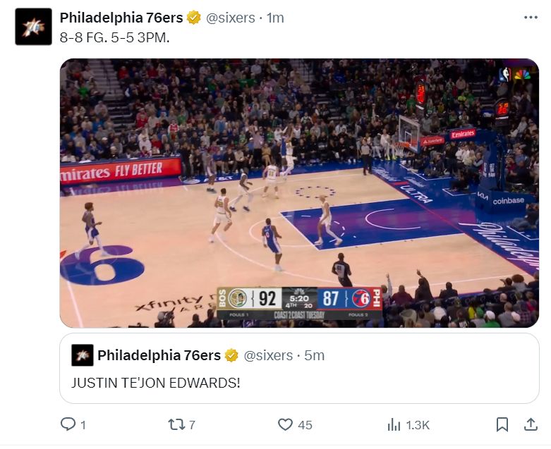 末节还剩5分20秒,贾斯汀-爱德华兹命中他本场比赛的第五个三分球,他也帮助费城将分差缩小到2分,这一个三分球命中后费城官方都为他喝彩,全场球迷更是起身呐喊他的名字,现场已经有人在高呼MVP了。