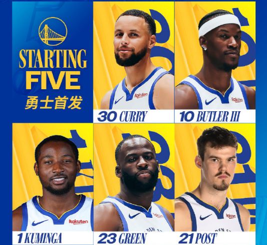 勇士:库里、巴特勒、追梦、库明加、波斯特