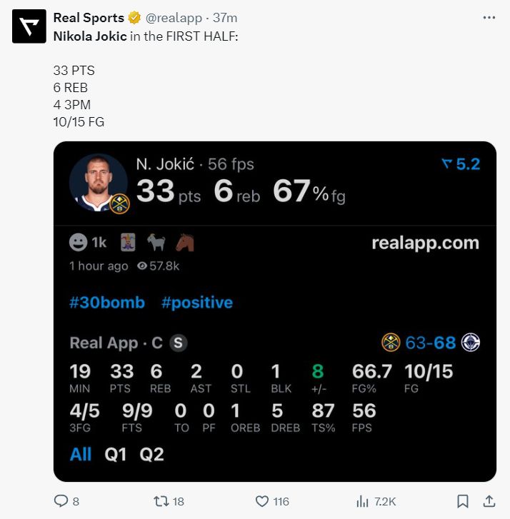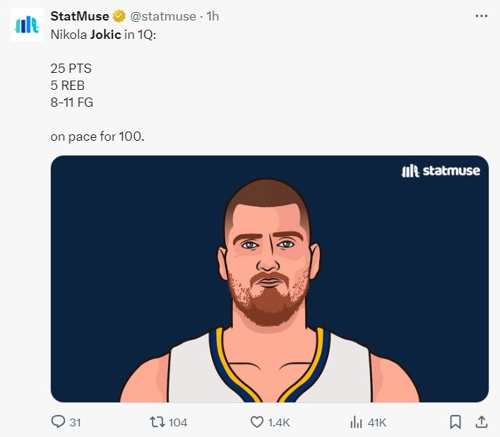 祖巴茨这个赛季的防守能力是肉眼可见的下滑,约基奇首节11中8,三分3中2,罚球7中7,拿到25分5篮板1助攻1盖帽,命中率72.7%,半场进攻无死角。