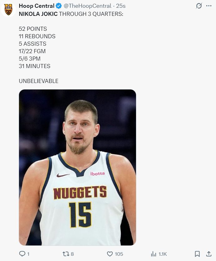 全场比赛约基奇33分钟,23中18,三分6中5,罚球16中14,拿到55分12篮板6助攻1抢断1盖帽,命中率78.3%,三分命中率83.3%,真实命中率91.5%,正负值+28。