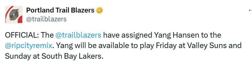 北京时间11月14日,波特兰开拓者官方宣布,球队已将杨瀚森下放到其下属发展联盟球队撕裂之城混音队。杨瀚森可以在本周六对阵山谷太阳队以及下周一对阵南湾湖人队的比赛中上场。
