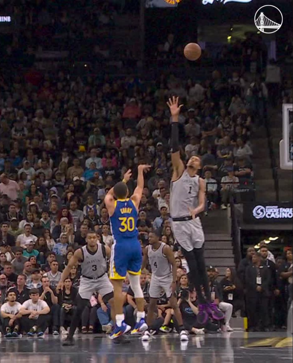 勇士官方晒出库里迎着文班亚马的长臂干扰命中高难度三分球。