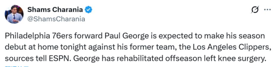 北京时间11月18日,据名记Shams报道,保罗-乔治将在今日对阵快船的比赛中正式复出,完成本赛季的个人首秀。