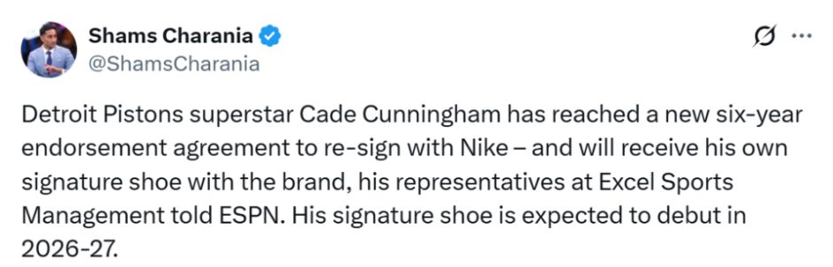 北京时间11月18日,底特律活塞队后卫凯德-坎宁安将继续与耐克公司合作,而且不久后还会推出个人专属签名球鞋。据名记Shams报道,坎宁安已与耐克达成一份新的六年代言协议,其专属签名球鞋预计于2026-27赛季下半程正式亮相。