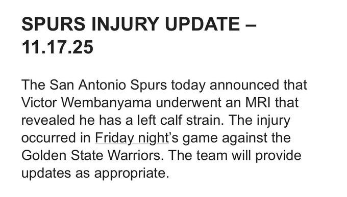 “联盟消息人士透露,马刺队将在两到三周后重新评估文班亚马的伤情,他至少会休战两周。鉴于近期有多起小腿伤势后续恶化的情况出现,马刺队此次处理格外谨慎。另外说句供参考的话,据称文班亚马本人感觉并无大碍。”