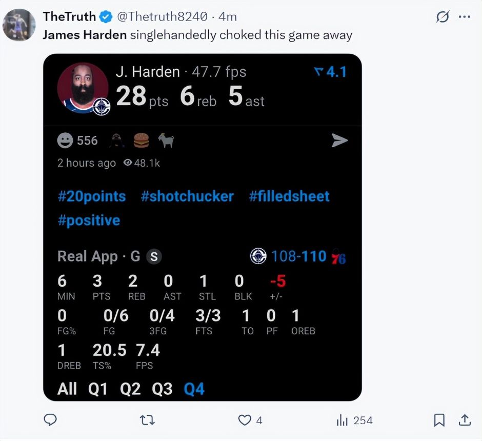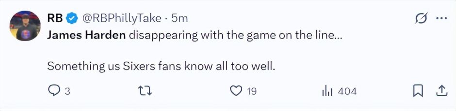 费城球迷:詹姆斯-哈登在比赛关键时刻突然隐身,这是我们费城球迷们都非常清楚的事情。