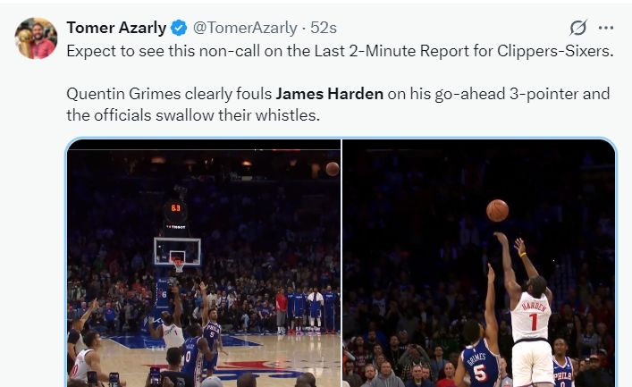 快船记者Tomer Azarly赛后非常愤怒,他写道:预计在明天的最后两分钟裁判报告里会有这样的描述,格兰姆斯对哈登投出关键三分时明显犯规了,但裁判们却没有吹罚。