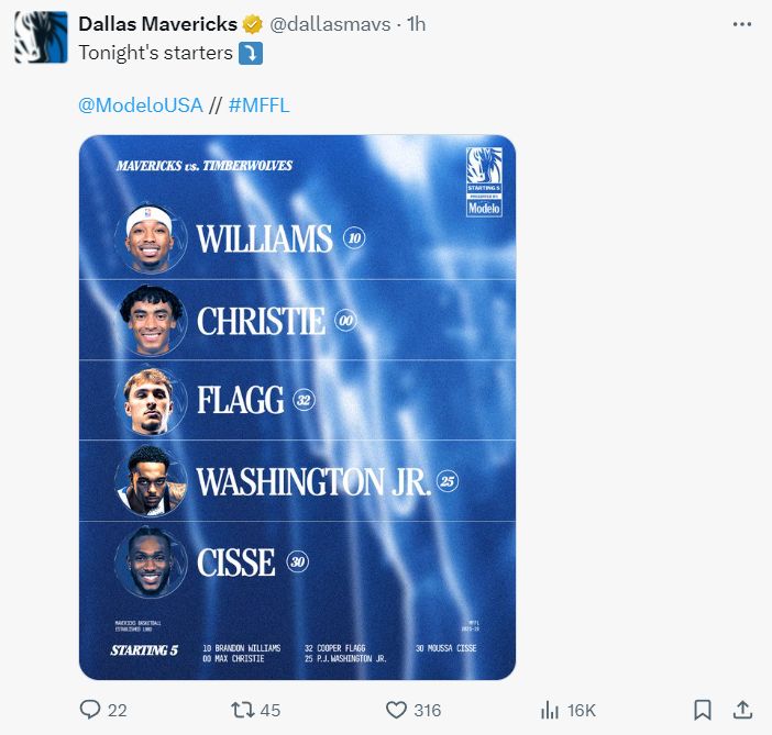 赛点独行侠主帅基德表示:浓眉、加福德、莱夫利、欧文、艾克萨姆、内姆布哈德六人缺席,双向合同落选秀西塞进入先发阵容。