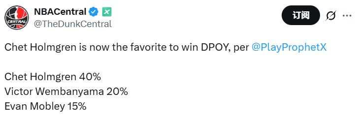 这位21岁的前状元秀本赛季场均贡献26.2分,同时以场均10.9个篮板和3.6次盖帽领跑全联盟。上赛季,他因肩部出现血凝块,缺席了赛季最后30场比赛,也因此无缘当选最佳防守球员。如今,本赛季开季不久,他又遭遇伤病问题,他会不会再次因出场次数不足而无缘DPOY?至少目前他的获奖概率已经降至第二,排在首位的是雷霆的霍姆格伦,第三是莫布利。