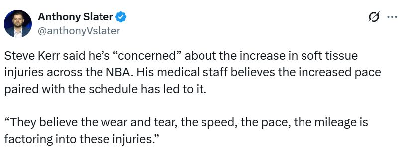 勇士队主教练科尔表示,他“深感担忧”,NBA比赛节奏的不断加快,再加上紧凑的82场常规赛赛程,正导致球员软组织损伤案例持续增多。