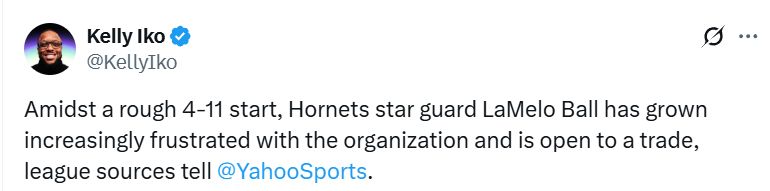 北京时间11月21日,据名记Iko报道,多位联盟消息人士透露,在黄蜂队客场令人失望地不敌仅2胜13负的步行者队后,明星后卫拉梅洛-鲍尔对球队的不满情绪日益加剧,并且愿意被交易离队。