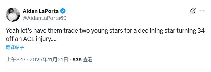 媒体人LaPorta讽刺道:“咱就这么办:让他们用两个年轻新星,去换一个即将34 岁、状态下滑还刚从交叉韧带撕裂伤病中恢复的球星……”