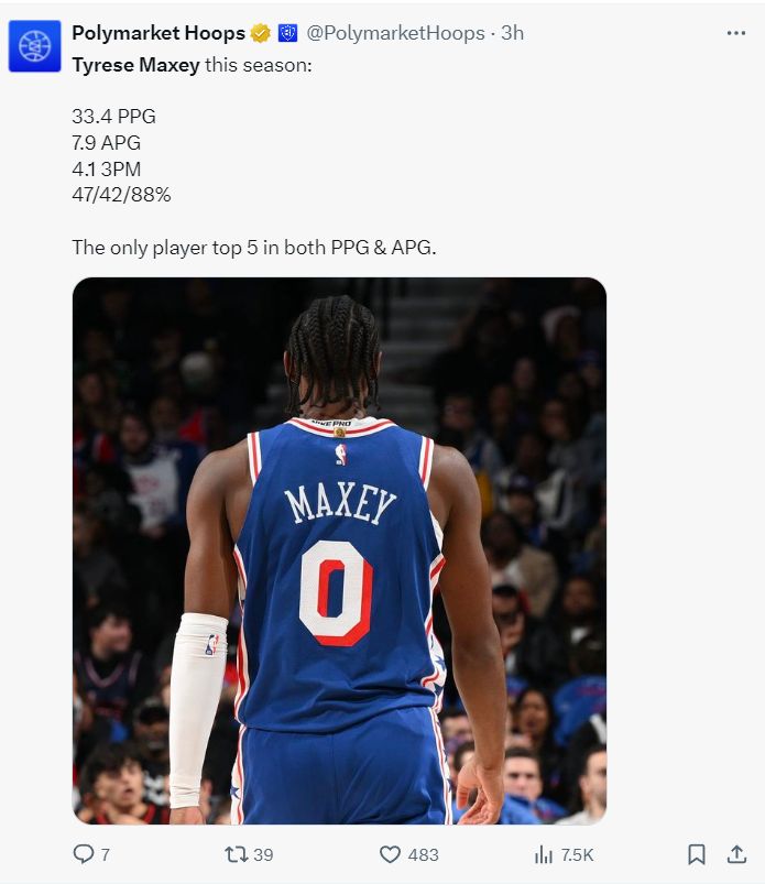 马克西本赛季场均33.4分7.9助攻4.7篮板4.1三分,命中率47%,三分命中率42%,联盟唯一一个得分、助攻都进入前五的球员。