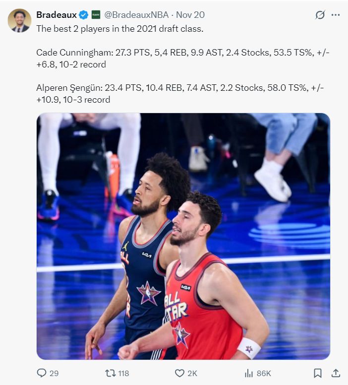 火箭记者Bradeaux写道:2021届最好的两位球员,活塞坎宁安,火箭申京!