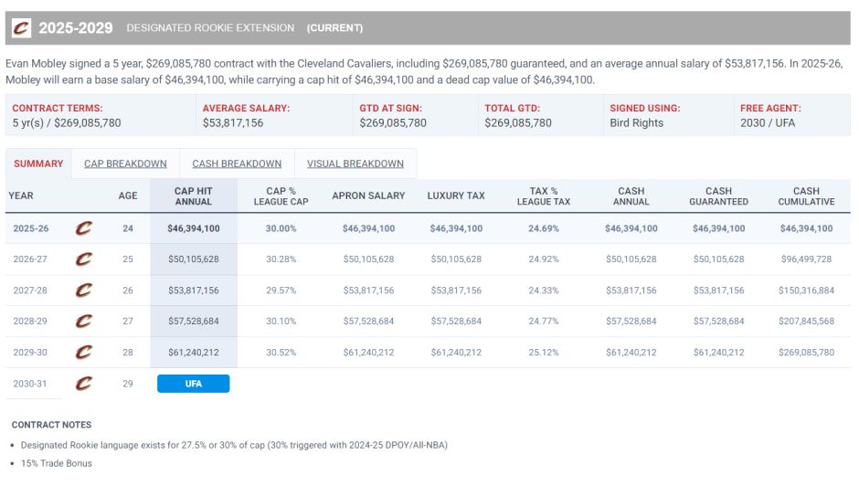 莫布利是去年夏天与骑士达成五年2.24亿的顶薪合同,随着他入选全明星、最佳防守一阵、最佳防守球员,莫布利的合同上浮到五年2.69亿,他本赛季的薪水高达4639万,而申京仅3394万差距接近1300万。