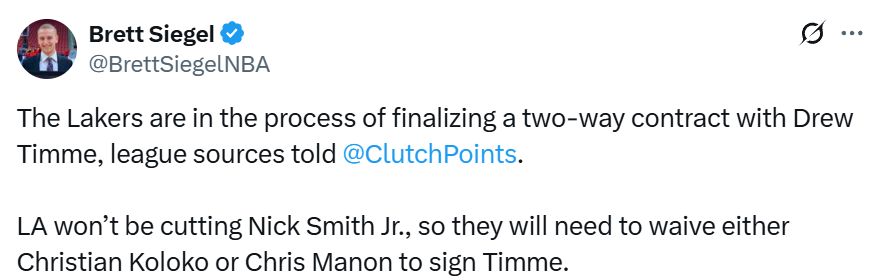 北京时间11月22日,据名记Siegel报道,洛杉矶湖人队计划与自由球员内线德鲁-蒂米签下一份双向合同。