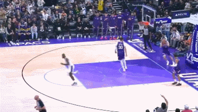 乔治为贝利传出空接,贝利高高跃起隔扣了八村垒。