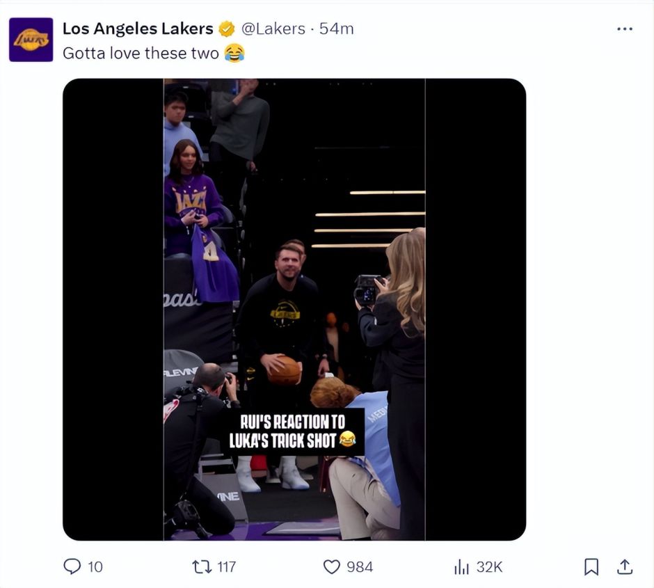 赛前东契奇在球员通道命中了超远三分,八寸垒笑着上来跟东契奇庆祝。