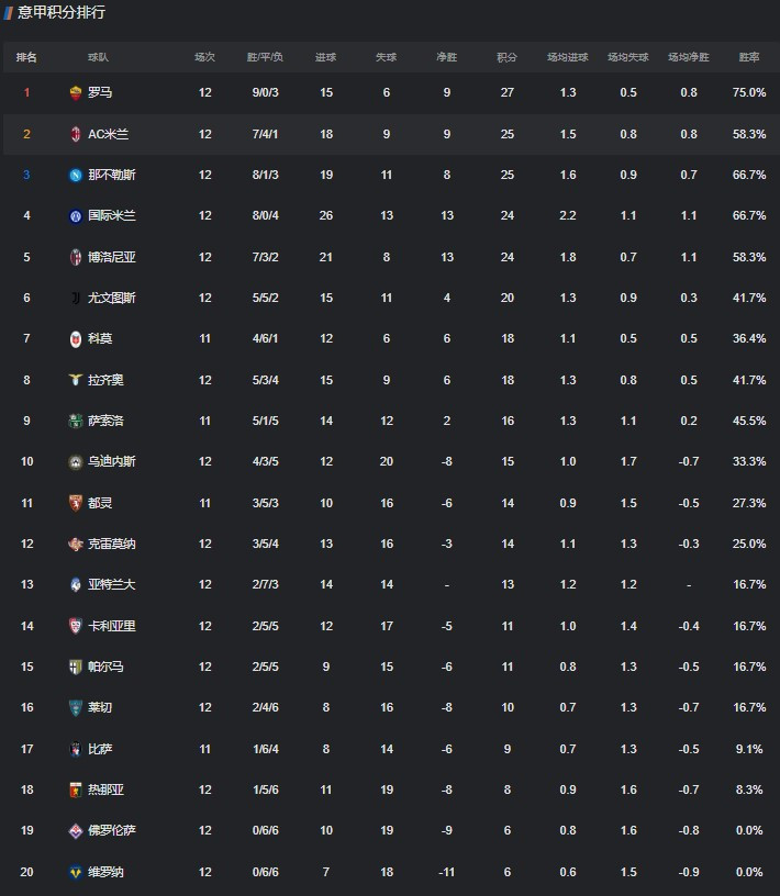 球迷屋11月24日讯,在经过了意甲的第12轮比赛之后罗马球队目前是以2分优势位居意甲联赛球队积分排行榜的第一名,球队上一次领跑联赛排行榜的时候是十年前。