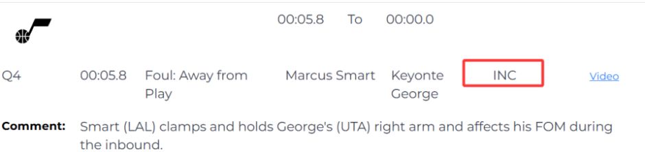第二次漏判发生在距离比赛结束还有5.8秒,湖人球员斯马特在发球阶段夹住并按住爵士球员乔治的右臂,干扰其接球动作,并导致他摔倒。这是一次漏吹的防守犯规,同样是湖人获利,爵士吃亏。