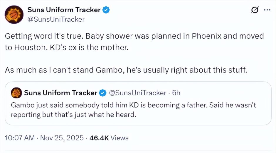 随后太阳媒体SUT写道:这是Gambadoro的说法,因为他还没有去核实消息的真实性他只是听到传闻,但如果这是真的,杜兰特的前女友就是宝宝的母亲,宝宝的满月酒原本计划在菲尼克斯,后来改在休斯顿了。