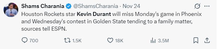 11月24日晚,ESPN记者Shams透露,火箭球星凯文-杜兰特因为个人原因将缺席对阵太阳、勇士两场比赛。