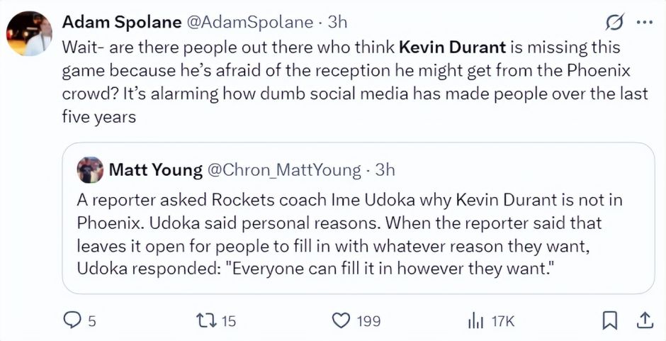 火箭记者Adam Spolane则写道:难道真的有人认为杜兰特缺席VS太阳是因为他害怕菲尼克斯球迷的冷眼吗?过去五年里,社媒的言论让人变得愚昧不堪。