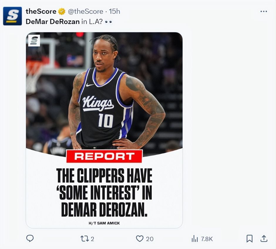 赛前TA记者萨姆-阿米克就报道,洛杉矶快船有意德罗赞,因为国王已经将德罗赞、拉文、小萨、蒙克等人摆上货架,甚至有传言说国王可能会裁掉德罗赞。