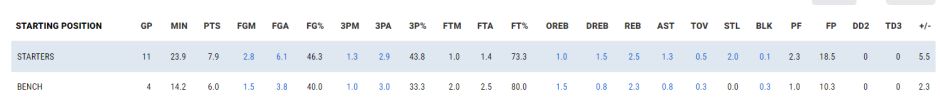 奥科吉本赛季先发11场比赛,场均23.9分钟,拿到7.9分2.5篮板1.3助攻2抢断0.1盖帽,命中率46.3%,三分命中率43.8%,场均命中1.3个三分球,正负值+5.5,也就是11场比赛正负值高达+61。