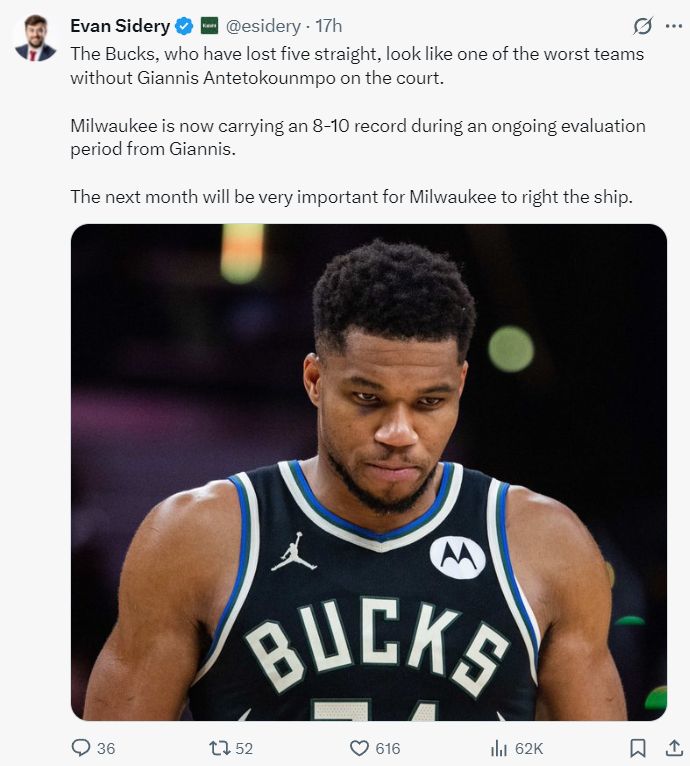 NBA记者埃文-斯迪瑞表示,雄鹿主场不敌开拓者后已经遭遇一波五连败,在扬尼斯缺席后,雄鹿俨然就是联盟最差劲的球队之一,目前雄鹿战绩8胜10负东部第九位,未来一个月对于雄鹿来说非常重要。