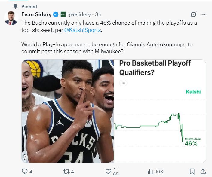 北京时间11月26日凌晨,埃文-斯迪瑞再度发文,根据KalshiSports 的数据。目前排名东部第九的雄鹿进入东部前六的概率只有46%。如果扬尼斯在季后赛中再登场一次这是否足以让他决定留守密尔沃基呢?