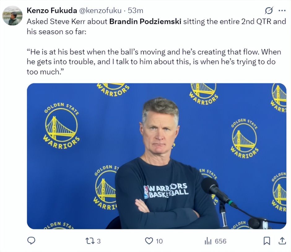 北京时间11月26日科尔在采访中被问及第二节为何不让波杰姆斯基登场,科尔说道:当球在空中飞行时他可以引领球的飞行轨迹,他就是最出色的那个。而当他陷入困境时那往往是他试图做得太多,我私下已经跟他沟通过这个问题。
