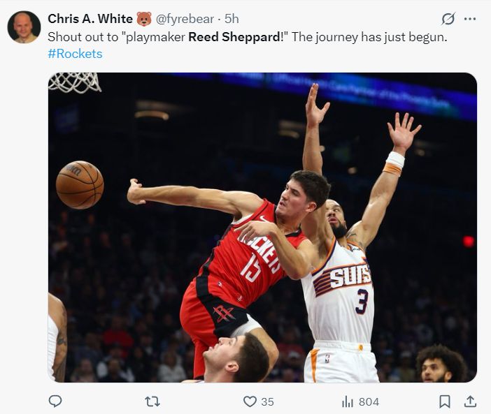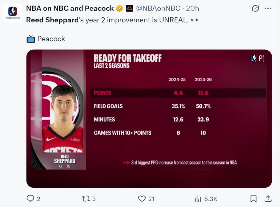 火箭记者克里斯-怀特晒出谢泼德一张妙传的图写道:向火箭的组织核心谢泼德致敬。这说明谢泼德的传球能力也在获得外界认可。