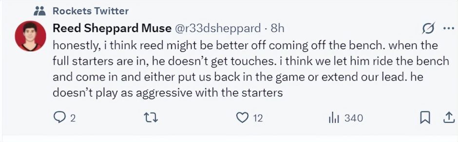 紧接着美媒写道:老实说我认为谢泼德更适合打替补,当他是先发时他没有太多机会与球权。我们应该让他在替补席上,然后关键时刻登场,要么帮助球队重新取得领先,要么帮助我们重新获得领先,与主力们一起登场,他的进攻积极性明显不高。