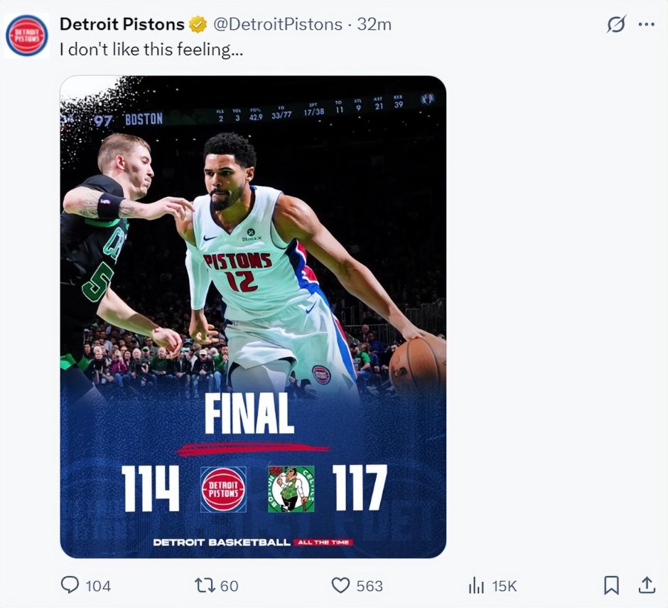 北京时间11月27日,活塞客场114-117不敌凯尔特人,这场比赛的失利对于东部第一的汽车城来说是沉重的失利,他们不仅仅是错过了队史最长的14连胜,他们还吞下了NBA杯赛的首败。