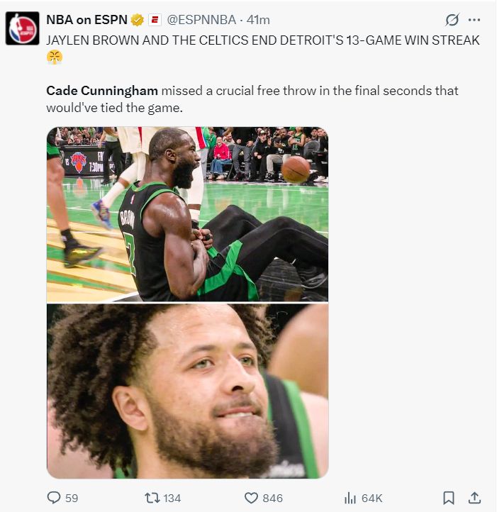 这场比赛坎宁安输球后气得咬牙切齿,他对自己的表现是非常不满意,因为他手握绝平但错失了,就算拿到40+的高分也无济于事,杰伦布朗拿到33分10篮板5助攻2抢断2盖帽才是赢家。