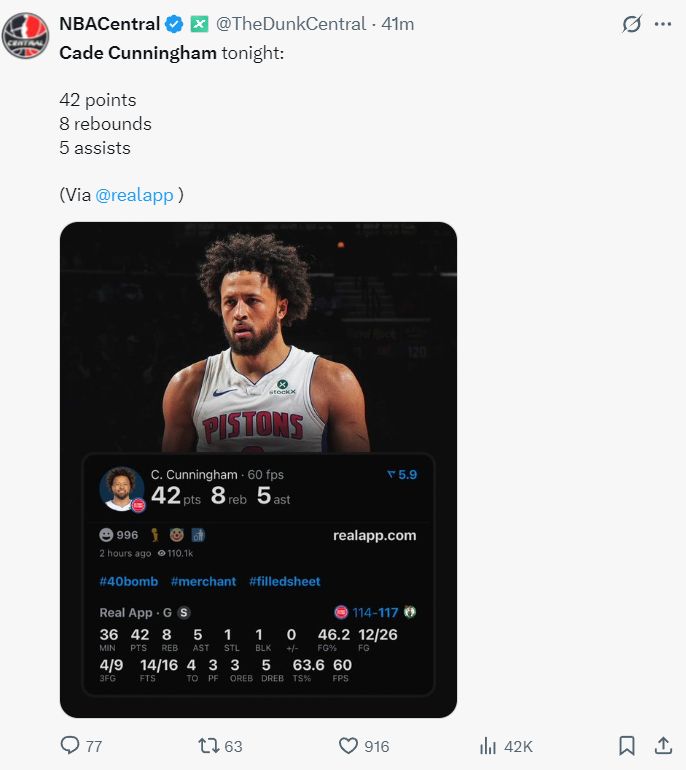 此役全场比赛坎宁安36分钟,26中12,三分9中4,罚球16中14,拿到42分8篮板5助攻1抢断1盖帽,命中率46.2%,三分命中率44.4%,真实命中率63.6%,还是输球了。