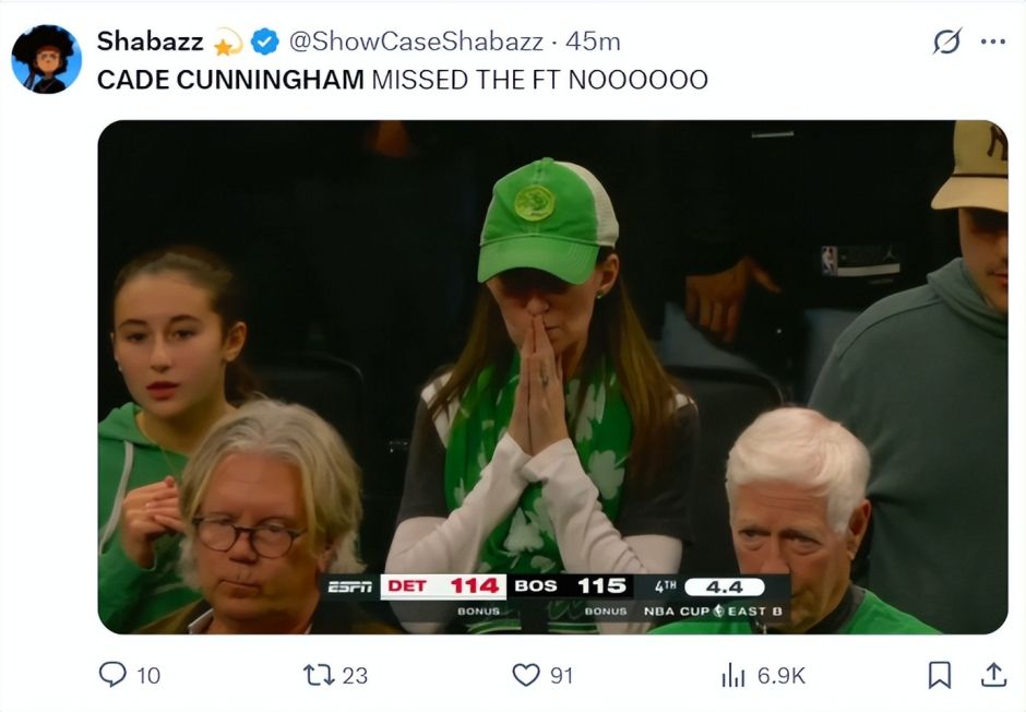 终场前4.4秒,沃尔什对坎宁安三分犯规,只要三罚全中活塞就完成绝平,CC前两罚都命中了,在两队一顿换人后CC第三罚的节奏被打乱,绿凯的球迷们都在祈祷,没想到CC真的没有罚进。